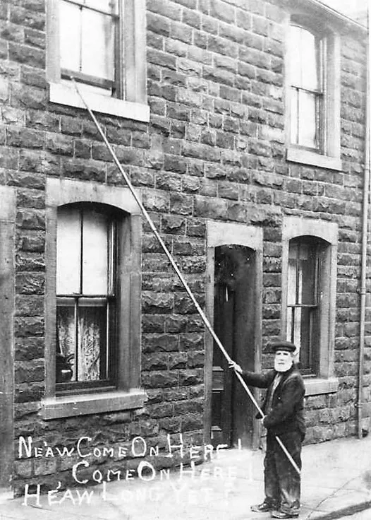 He is a professional Knocker-Up. Picture this: it’s 1880, and instead of a phone shrieking at you from your bedside, a gentleman called Barney walks by and taps your window with a bamboo stick.