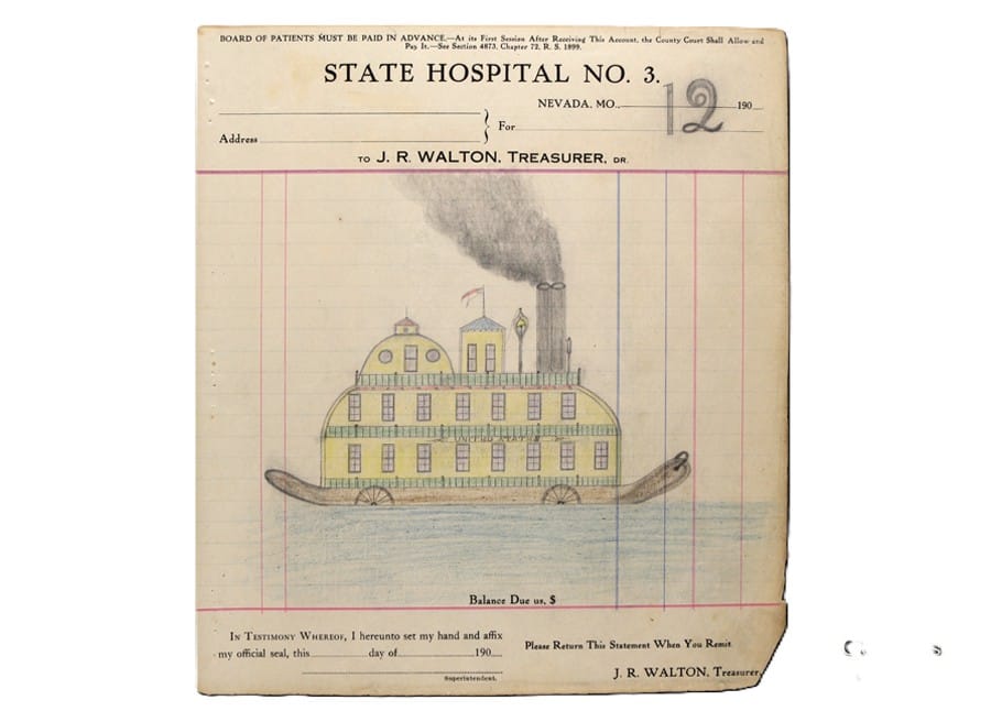 A great collection of artwork that gives an interesting look into the life of a mental hospital patient in the early 1900s. The artist is James Edward Deeds, Jr. who we have limited information about. We know he had a low IQ (under 80), was raised on a Missouri farm, and dealt with abuse from his father. He went from a school for the feeble-minded to a massive state hospital after threatening his younger brother in 1936. He was admitted at the age of 28 and spent most of his life confined within hospital walls undoing grueling treatments. His drawings are on outdated and discarded office paper from the hospital that are bound into a book he made for his mother.